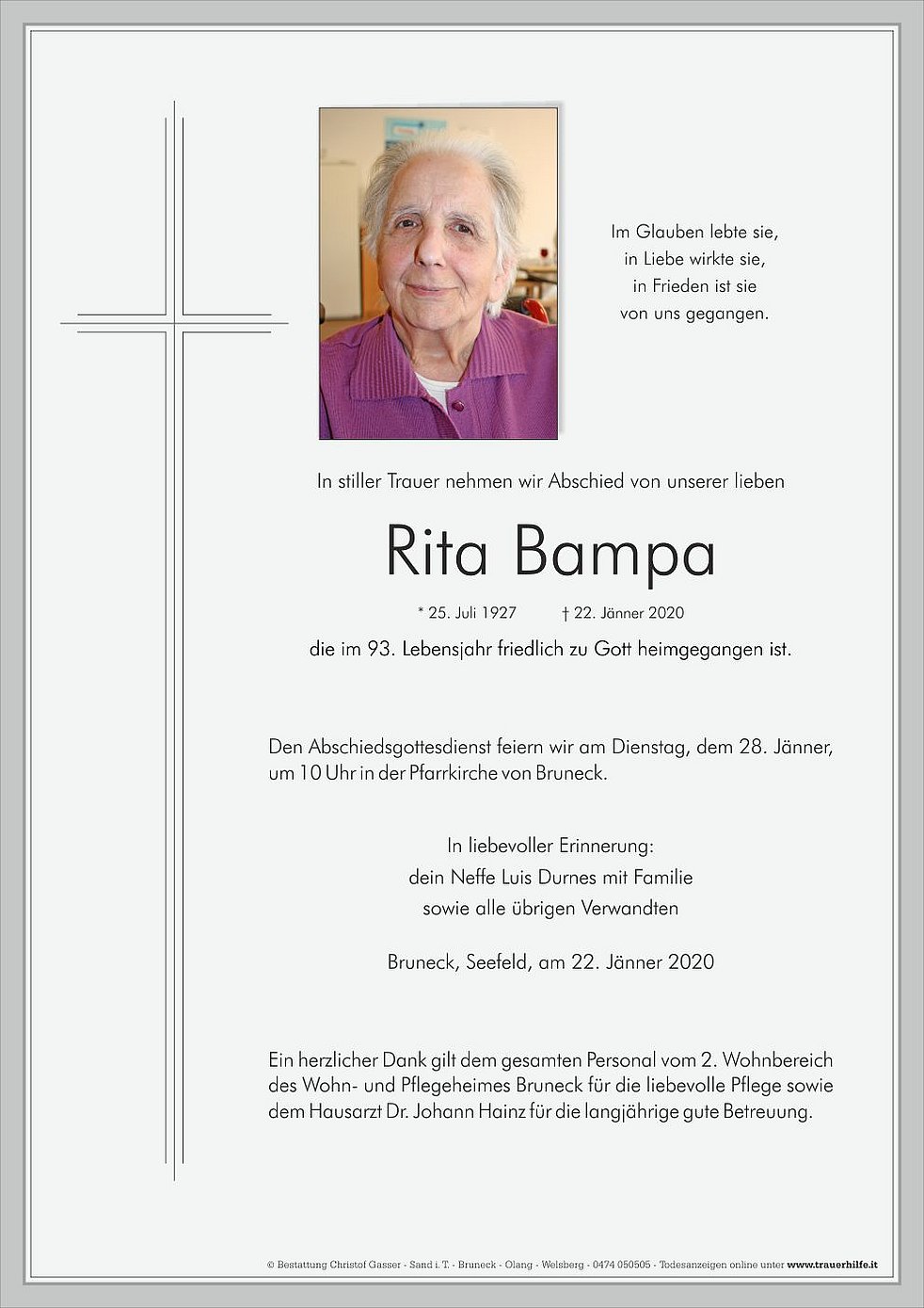 Ein herzlicher Dank gilt dem gesamten Personal vom 2. Wohnbereich des Wohn- und Pflegeheimes Bruneck für die liebevolle Pflege sowie dem Hausarzt Dr. Johann Hainz für die langjährige gute Betreuung.