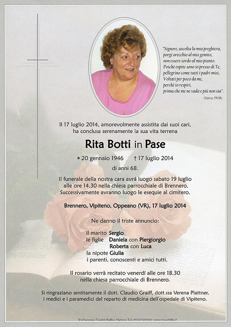 Den Trauergottesdienst feiern wir am Samstag, dem 19. Juli um 14.30 Uhr in der Pfarrkirche von Brenner. Anschließend begleiten wir unsere liebe Rita zur letzten Ruhe auf den Ortsfriedhof.