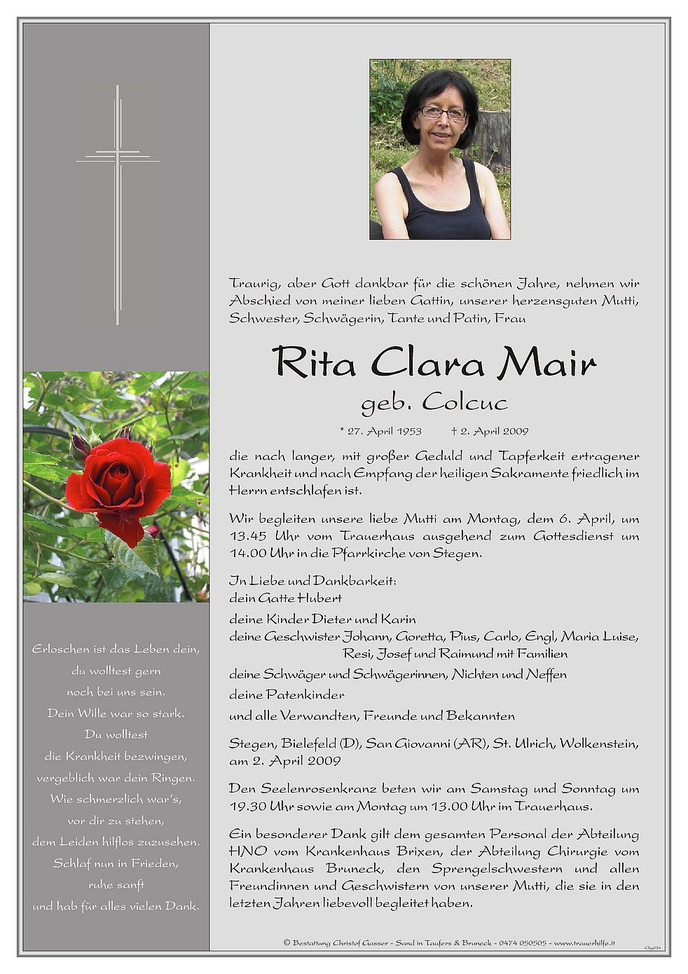 Ein besonderer Dank gilt dem gesamten Personal der Abteilung HNO vom Krankenhaus Brixen, der Abteilung Chirurgie vom Krankenhaus Bruneck, den Sprengelschwestern und allen Freundinnen und Geschwistern von unserer Mutti, die sie in den letzten Jahren liebevoll begleitet haben.