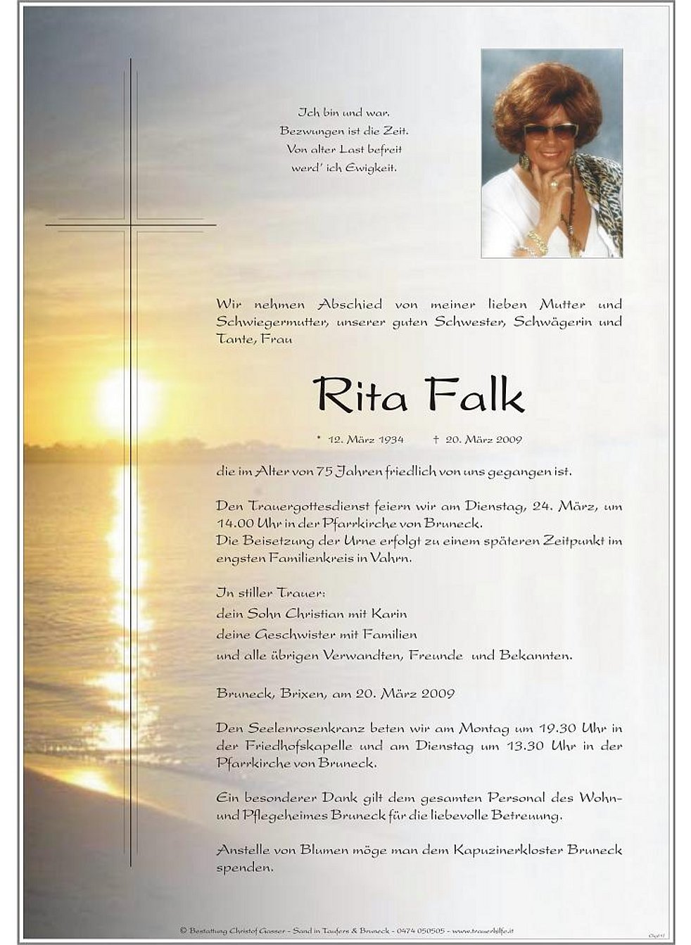 Den Trauergottesdienst feiern wir am Dienstag, 24. März, um 14.00 Uhr in der Pfarrkirche von Bruneck.
