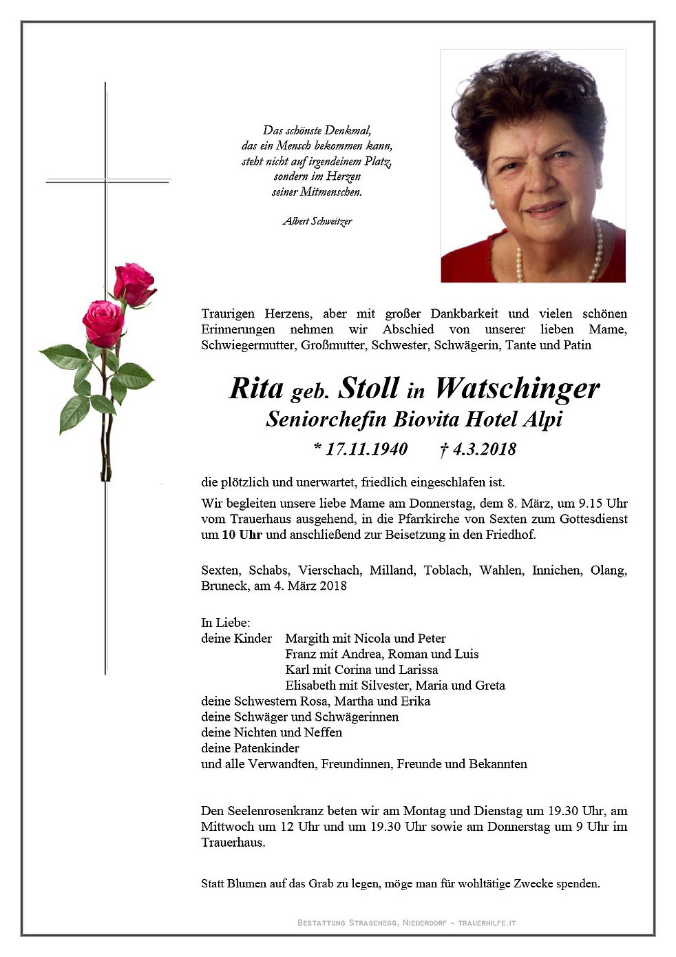 Wir begleiten unsere liebe Mame am Donnerstag, dem 8. März, um 9.15 Uhr vom Trauerhaus ausgehend, in die Pfarrkirche von Sexten zum Gottesdienst um 10 Uhr und anschließend zur Beisetzung in den Friedhof.