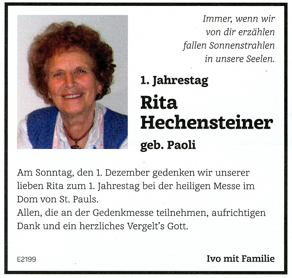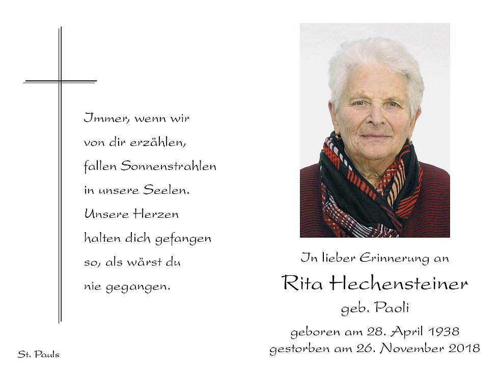 Den Begräbnisgottesdienst feiern wir am Freitag, dem 30. November um 14.30 Uhr in der Pfarrkirche von St. Pauls.