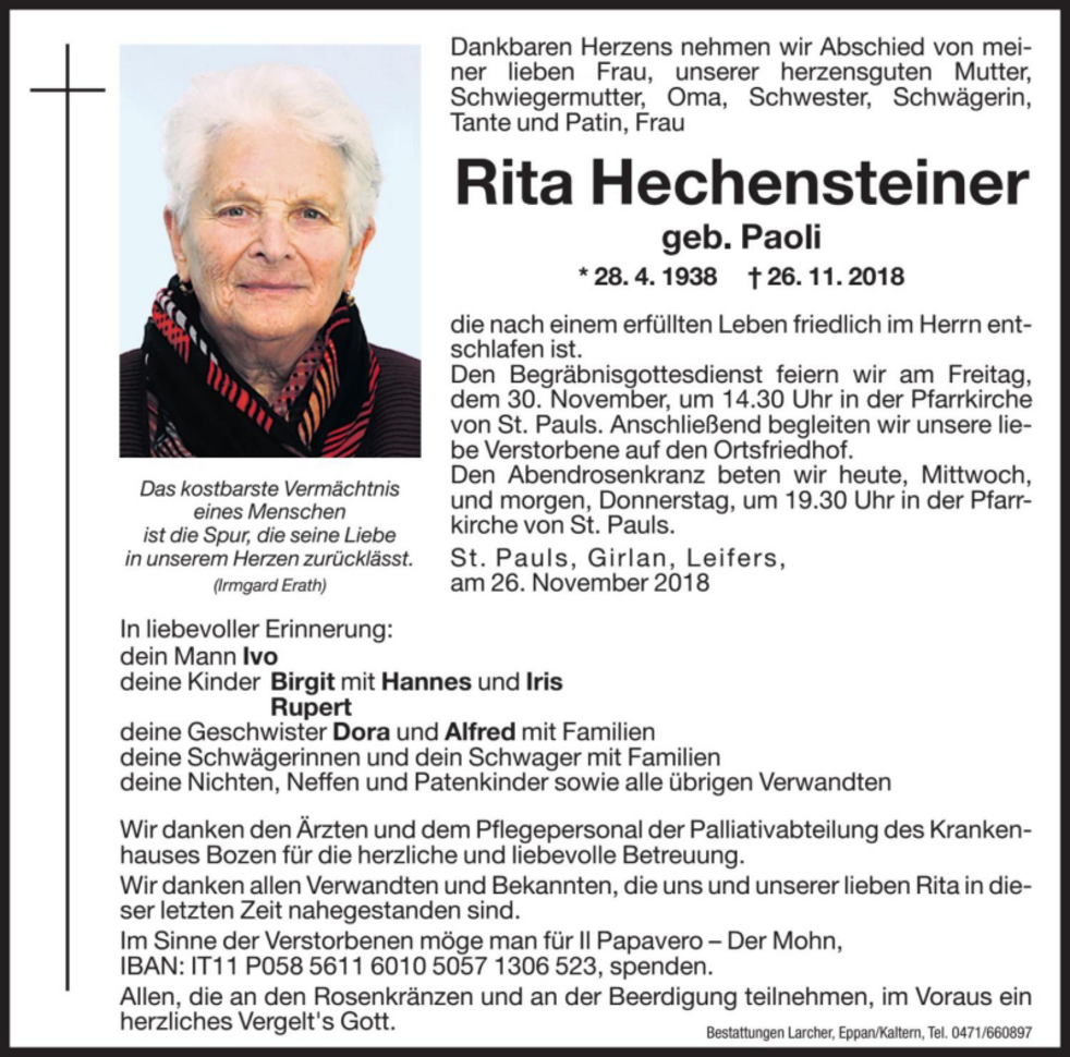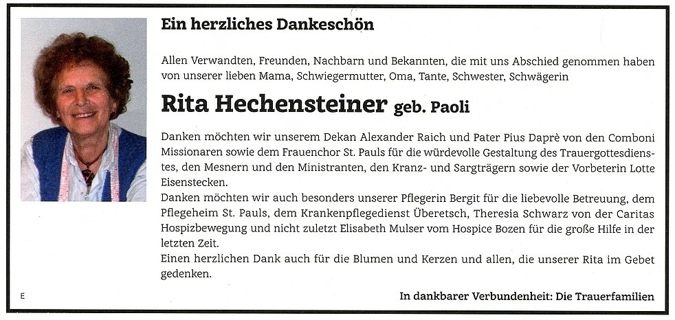 Im Sinne der Verstorbenen möge man für Il Papavero - Der Mohn, IBAN: IT11 P058 5611 6010 5057 1306 523, spenden.