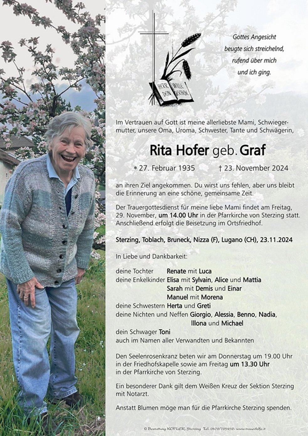 Der Trauergottesdienst für meine liebe Mami findet am Freitag, 29. November, um 14.00 Uhr in der Pfarrkirche von Sterzing statt. Anschließend erfolgt die Beisetzung im Ortsfriedhof.