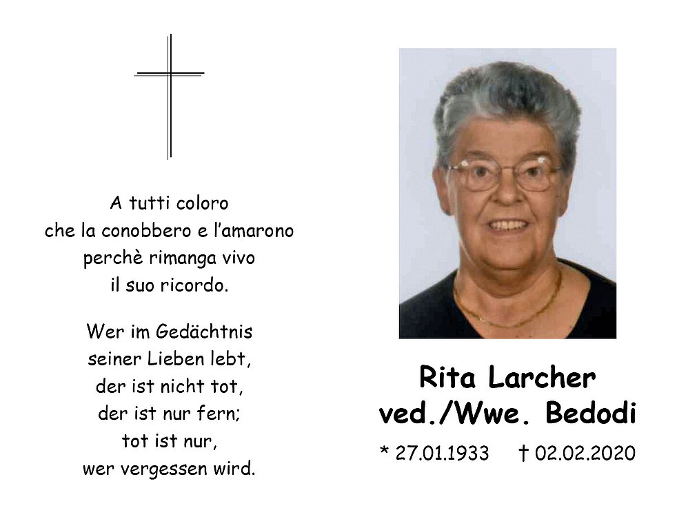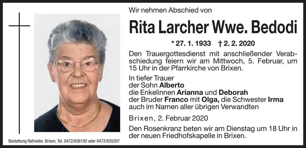 Gedankt sei dem Hausarzt Dr. Walter Niederstätter und dem Hauspflegedienst Sprengel Brixen für die liebevolle Betreuung sowie allen, die am Rosenkranz und an der Verabschiedung teilnehmen.