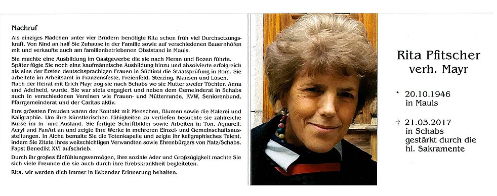 Anschließend Trauergottesdienst in der Kirche von Schabs und Beisetzung im Ortsfriedhof.