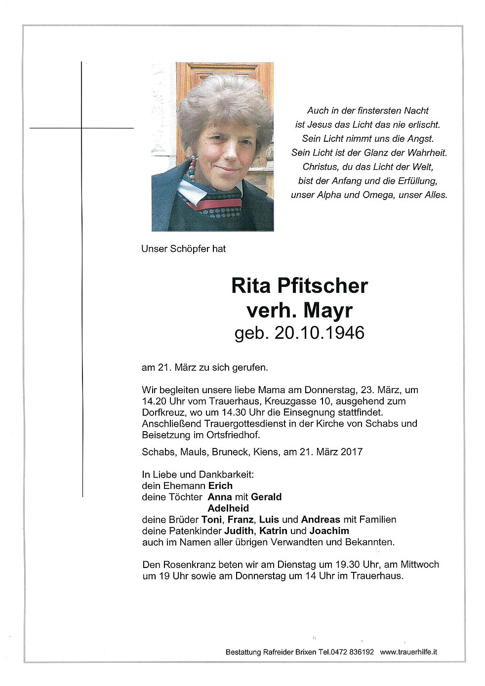 Den Rosenkranz beten wir am Dienstag um 19.30 Uhr, am Mittwoch um 19 Uhr sowie am Donnerstag um 14 Uhr im Trauerhaus.