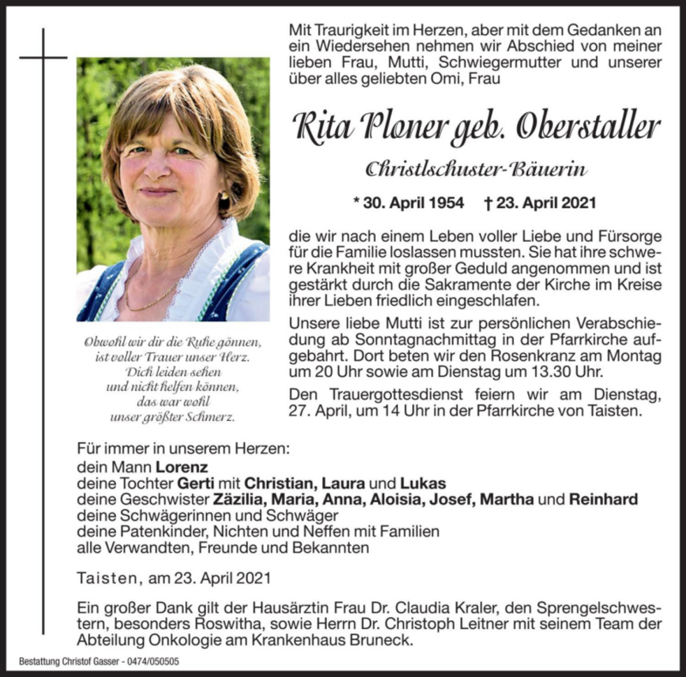 die wir nach einem Leben voller Liebe und Fürsorge für die Familie loslassen mussten. Sie hat ihre schwere Krankheit mit großer Geduld angenommen und ist gestärkt durch die Sakramente der Kirche im Kreise ihrer Lieben friedlich eingeschlafen.