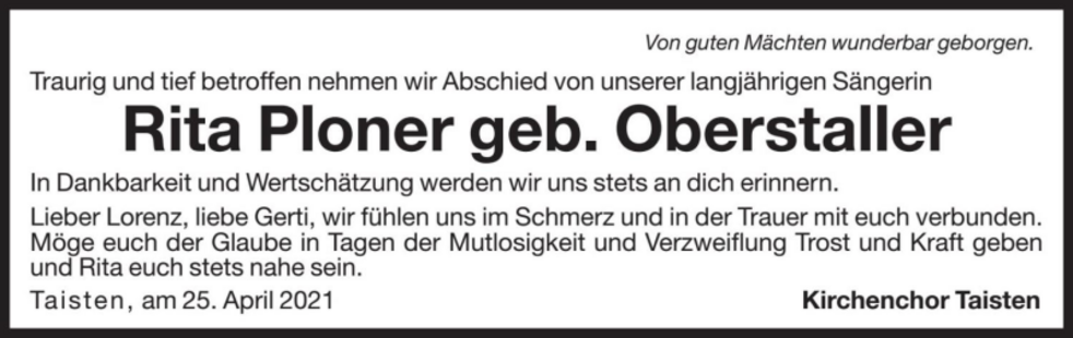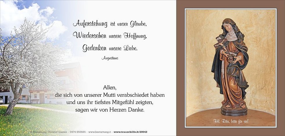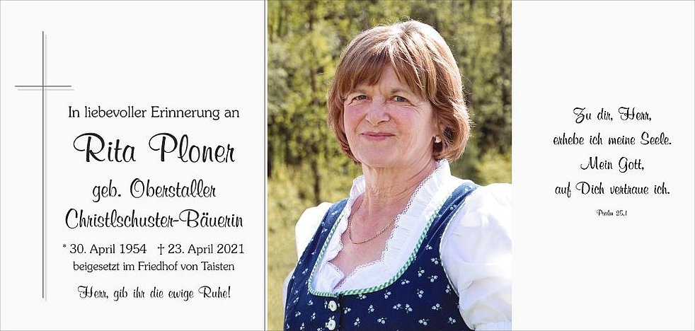 Den Trauergottesdienst feiern wir am Dienstag, 27. April, um 14 Uhr in der Pfarrkirche von Taisten.