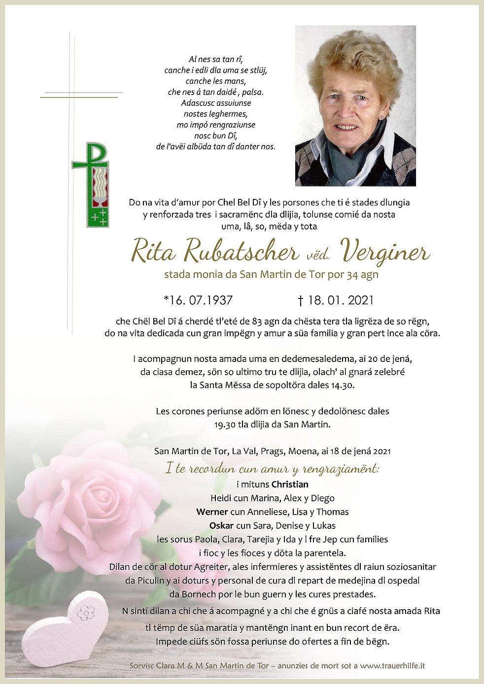 Wir begleiten unsere liebe Mutter und Oma am Mittwoch, dem 20. Januar, vom Trauerhaus ausgehend zum Abschiedsgottesdienst um 14.30 Uhr in die Pfarrkirche von St. Martin in Thurn.
