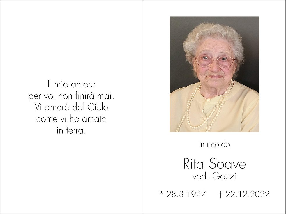 Ne danno il triste annuncio le figlie Graziella con Luigi, Daniela con Stefano, gli adorati nipoti Mattia con Alessandra, Chiara con Simone, Daniel con Maria Vittoria, e Matteo, i pronipoti Elia e Ettore, le sorelle, il fratello e parenti tutti.