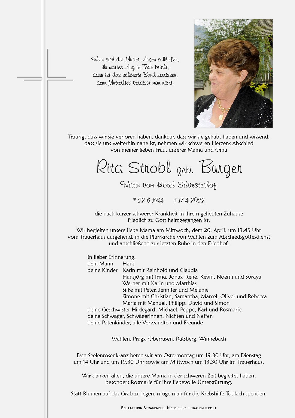 Wir begleiten unsere liebe Mama am Mittwoch, dem 20. April, um 13.45 Uhr vom Trauerhaus ausgehend, in die Pfarrkirche von Wahlen zum Abschiedsgottesdienst und anschließend zur letzten Ruhe in den Friedhof.