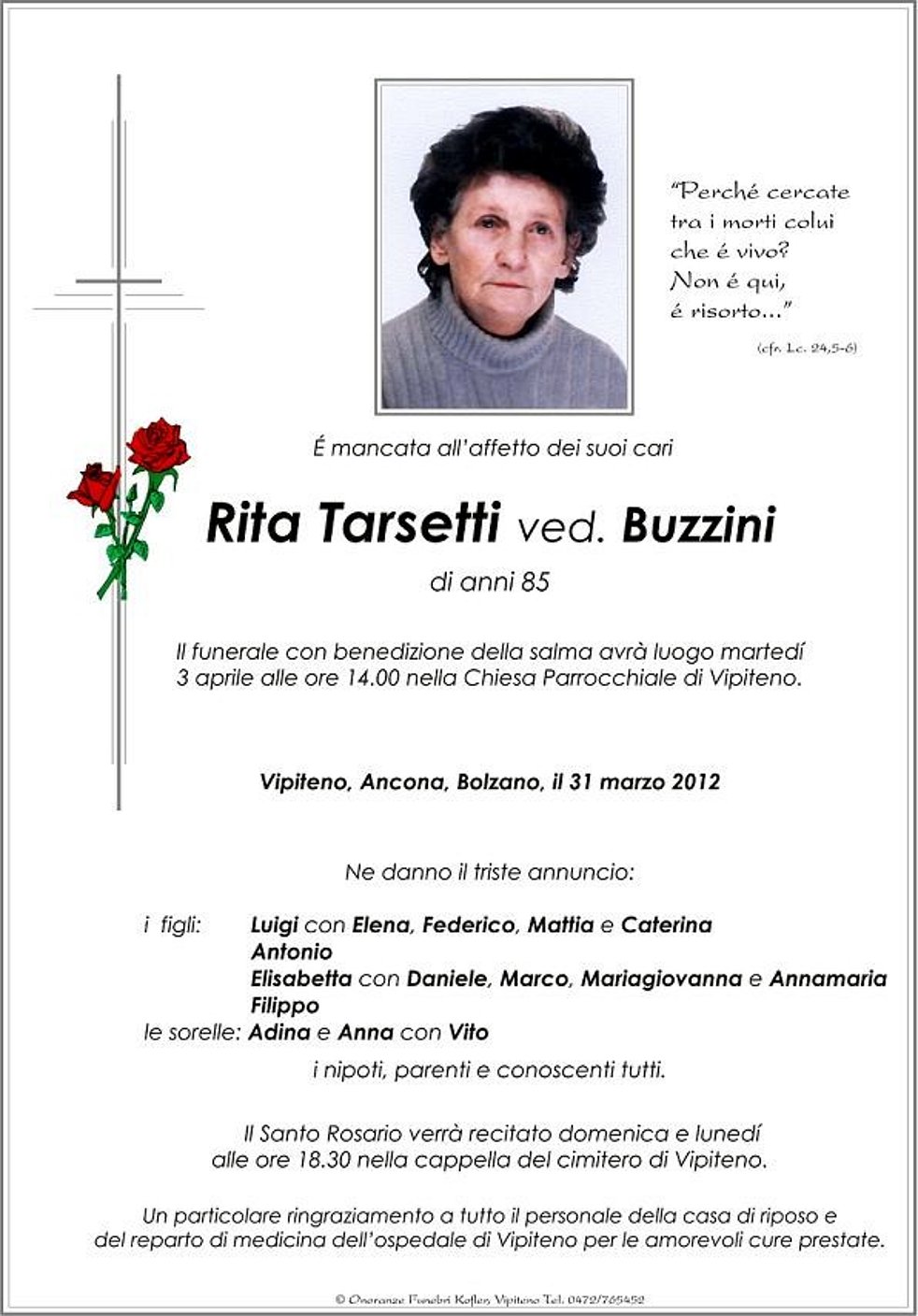 alle ore 18.30 nella cappella del cimitero di Vipiteno.