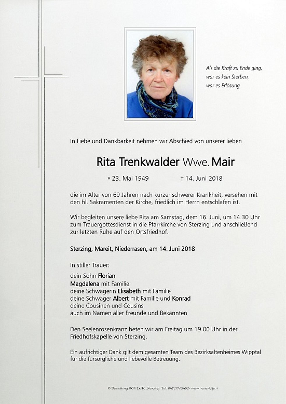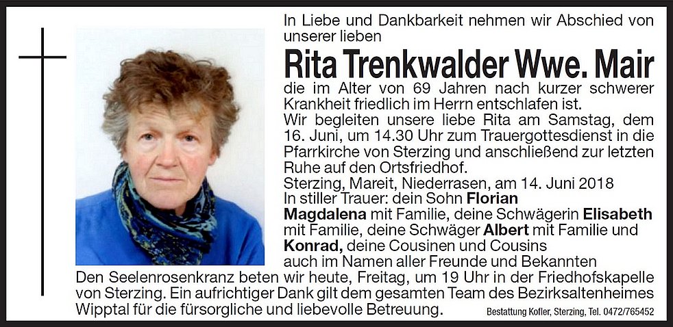 Wir begleiten unsere liebe Rita am Samstag, dem 16. Juni, um 14.30 Uhr zum Trauergottesdienst in die Pfarrkirche von Sterzing und anschließend zur letzten Ruhe auf den Ortsfriedhof.