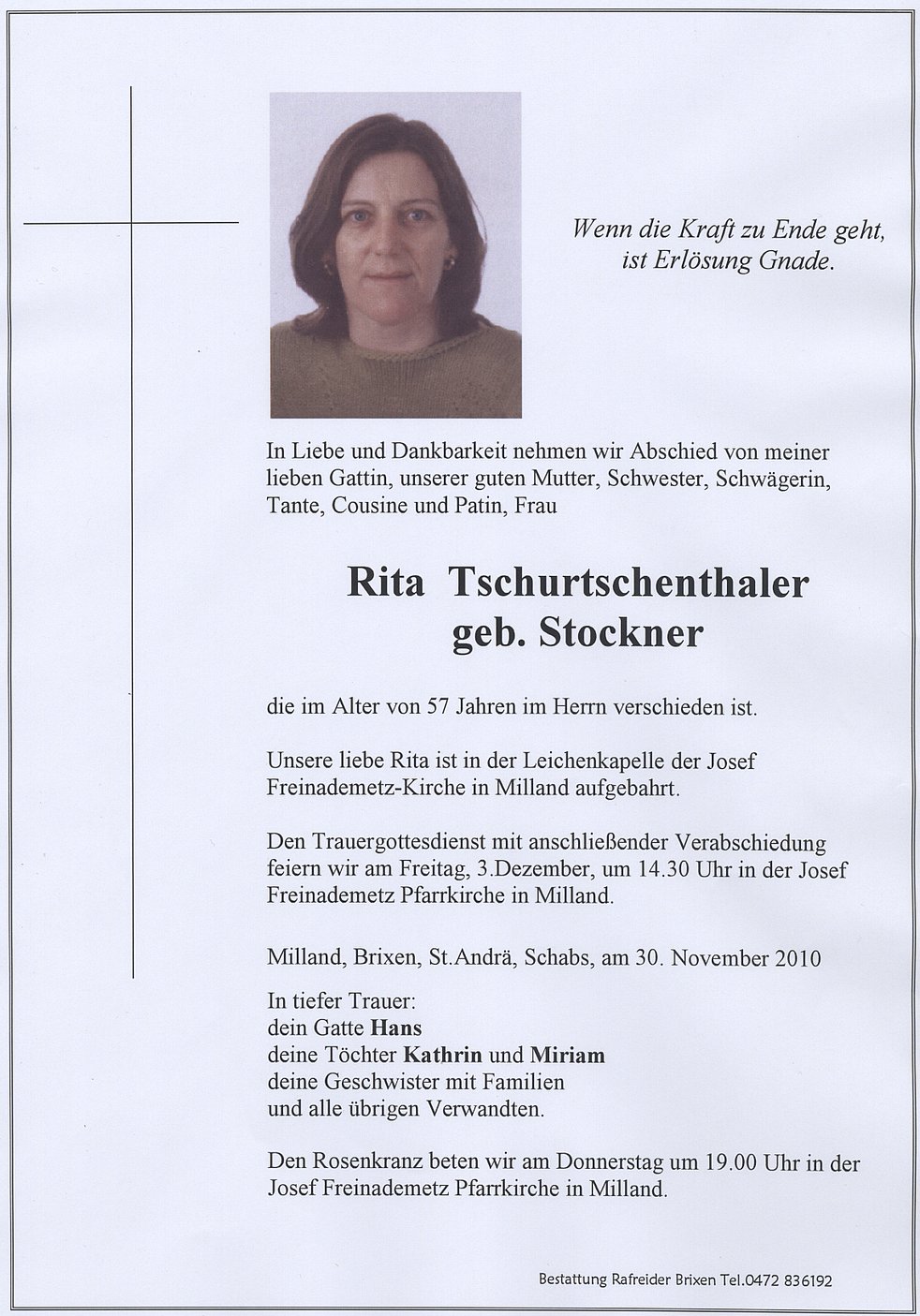 Gedankt sei dem Hausarzt Dr. Bruno Letrari, den Ärzten und dem Pflegepersonal der Abteilung Medizin I des Brixner Krankenhauses für die liebevolle Betreuung und allen, die am Rosenkranz und an der Verabschiedung teilnehmen.