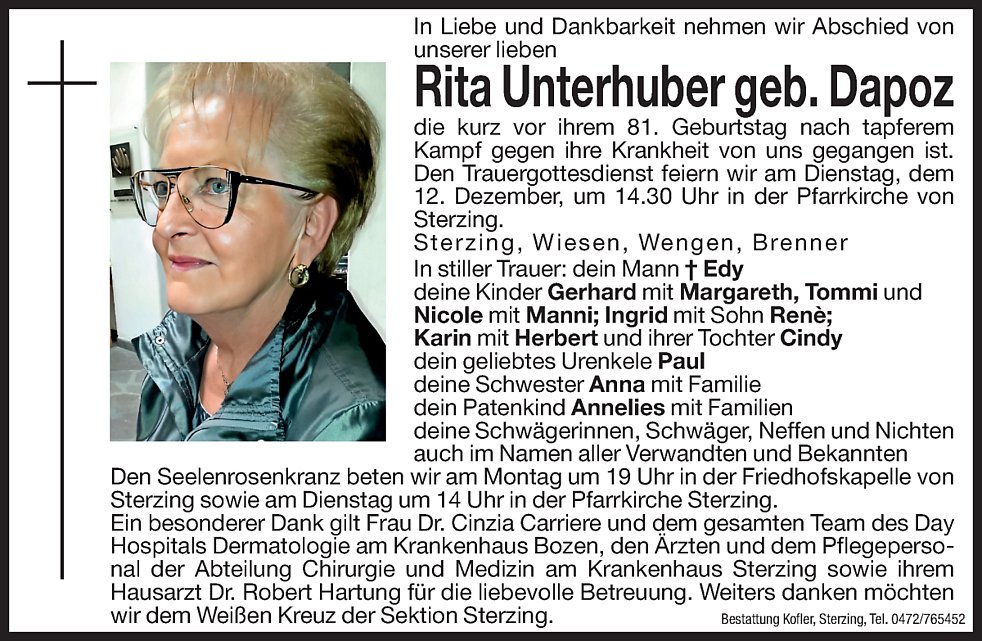 Den Trauergottesdienst feiern wir am Dienstag, dem 12. Dezember, um 14.30 Uhr in der Pfarrkirche von Sterzing. Anschließend findet die Urnenbeisetzung im engsten Familienkreis statt.