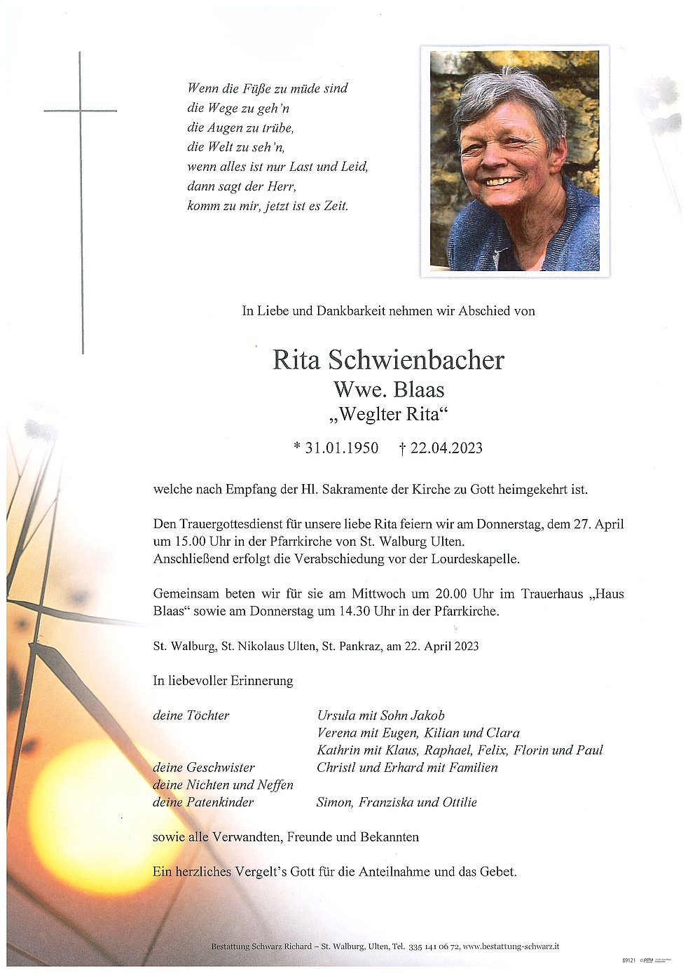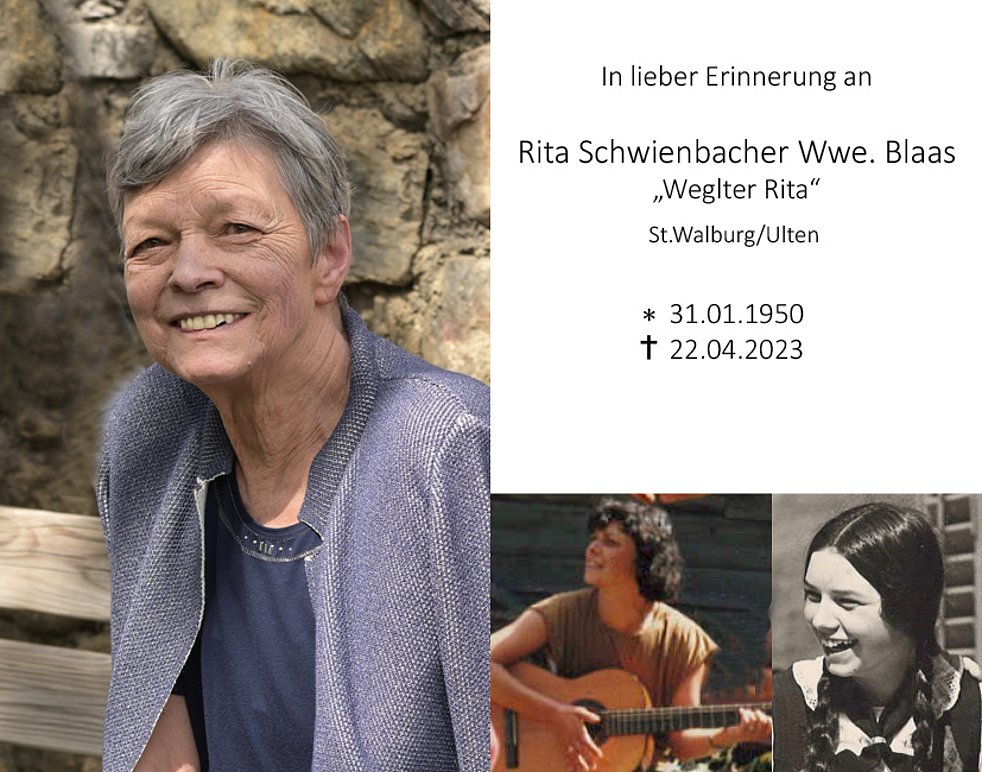 Den Trauergottesdienst für unsere liebe Rita feiern wir am Donnerstag, dem 27. April um 15.00 Uhr in der Pfarrkirche von St. Walburg Ulten.