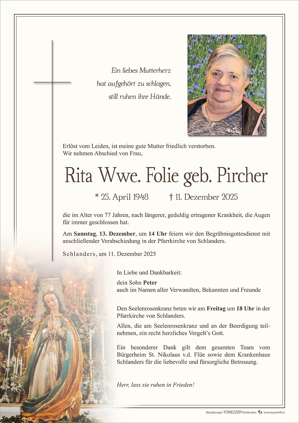 mit großer Betroffenheit habe ich vom Tod deiner Mutter erfahren. Es fällt schwer die richtigen Worte zu finden , denn der Verlust eines so vertrauten Menschen hinterlässt eine schmerzliche Lücke. Mit Rita verliere ich eine sehr liebe Freundin .Auch wenn wir uns in den letzten Jahren aus gesundheitlichen Gründen nur noch telefonisch hörten , habe ich unsere Gespräche und ihre warmherzige Art immer sehr geschätzt.