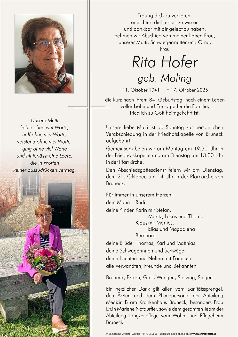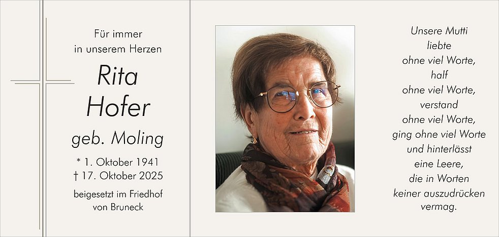 Unsere liebe Mutti ist ab Sonntag zur persönlichen Verabschiedung in der Friedhofskapelle von Bruneck aufgebahrt.