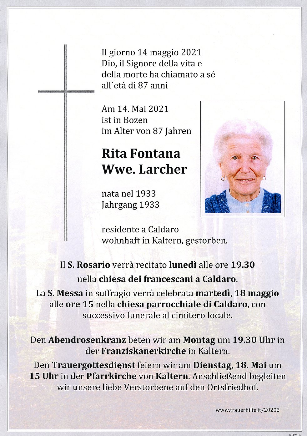 Den Trauergottesdienst feiern wir am Dienstag, dem 18. Mai um 15 Uhr in der Pfarrkirche von Kaltern. Anschließend begleiten wir unsere liebe Verstorbene auf den Ortsfriedhof.