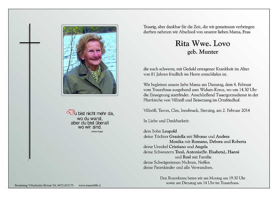 vom Trauerhaus ausgehend zum Widum-Kreuz, wo um 14.30 Uhr die Einsegnung stattfindet. Anschließend Tauergottesdienst in der Pfarrkirche von Villnöß und Beisetzung im Ortsfriedhof.