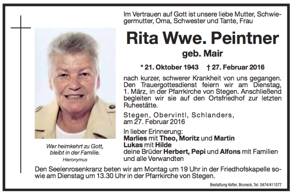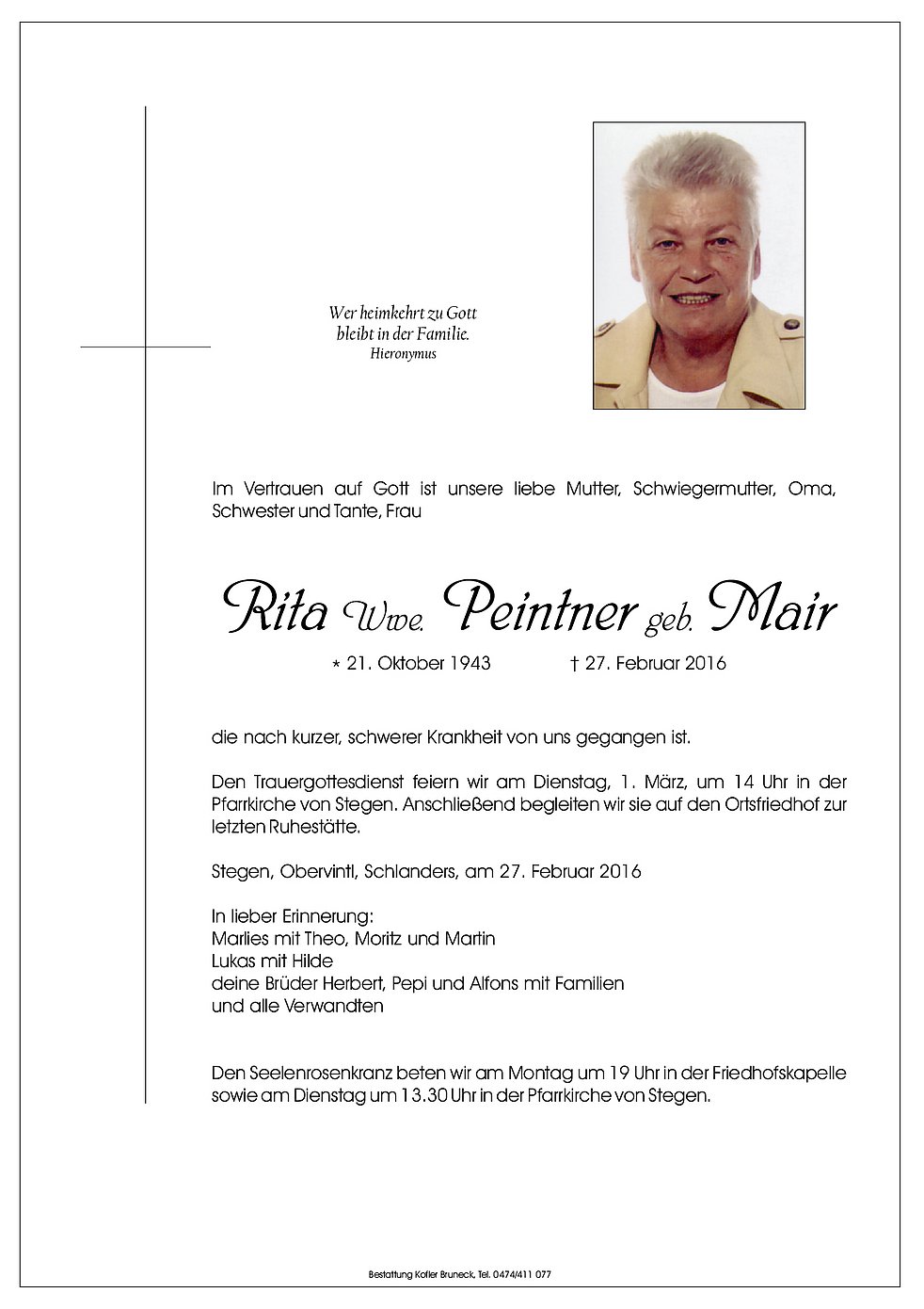 Den Trauergottesdienst feiern wir am Dienstag, 1. März, um 14 Uhr in der Pfarrkirche von Stegen. Anschließend begleiten wir sie auf den Ortsfriedhof zur letzten Ruhestätte.