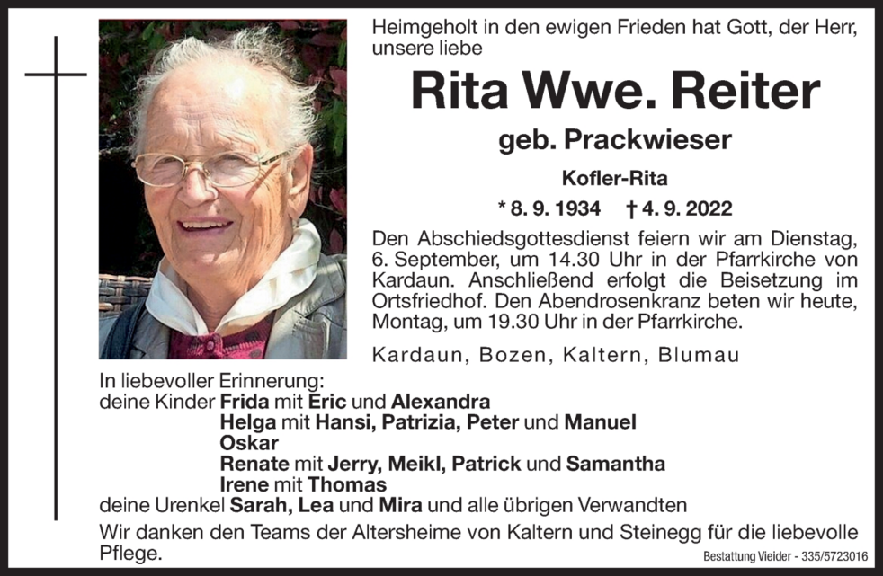 Den Abschiedsgottesdienst feiern wir am Dienstag, 6. September, um 14.30 Uhr in der Pfarrkirche von Kardaun. Anschließend erfolgt die Beisetzung im Ortsfriedhof.