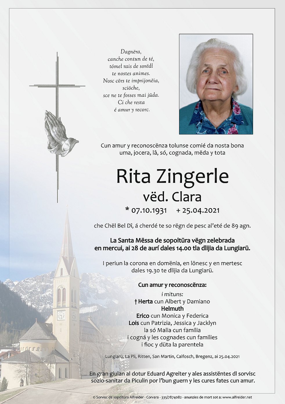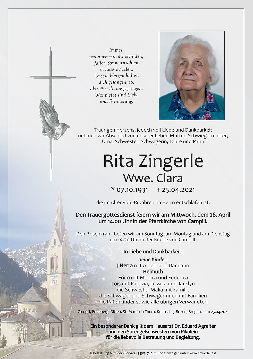 Den Trauergottesdienst feiern wir am Mittwoch, dem 28. April um 14.00 Uhr in der Pfarrkirche von Campill.