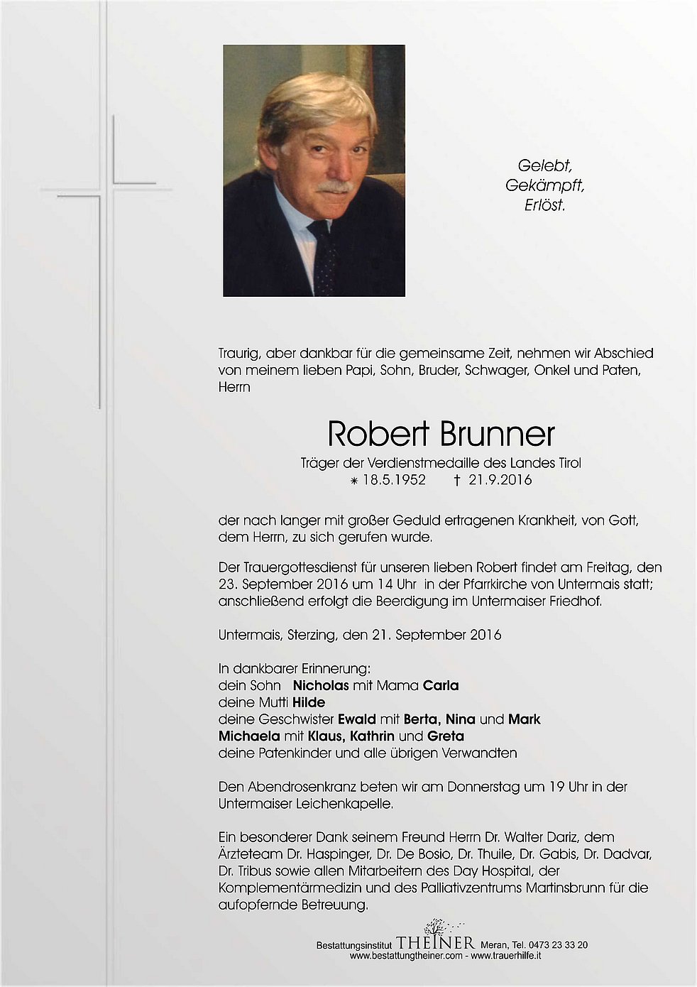 Der Trauergottesdienst für unseren lieben Robert findet am Freitag, den 23. September 2016 um 14 Uhr in der Pfarrkirche von Untermais statt;