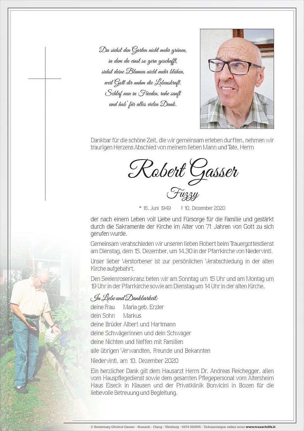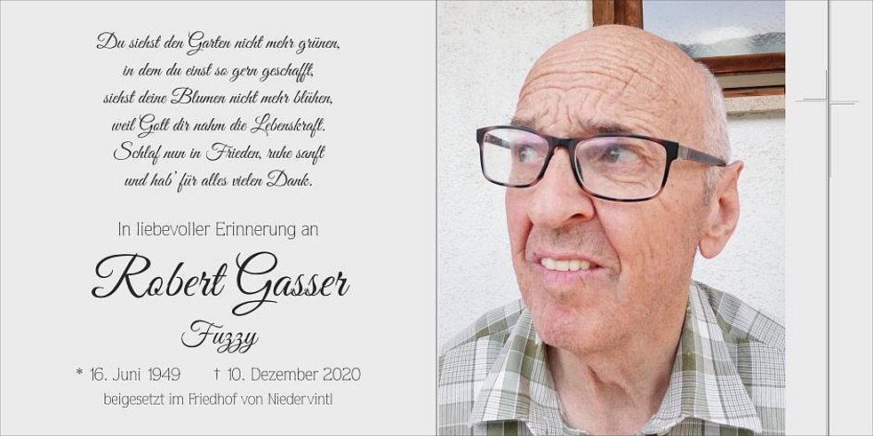 Gemeinsam verabschieden wir unseren lieben Robert beim Trauergottesdienst am Dienstag, dem 15. Dezember, um 14.30 in der Pfarrkirche von Niedervintl.