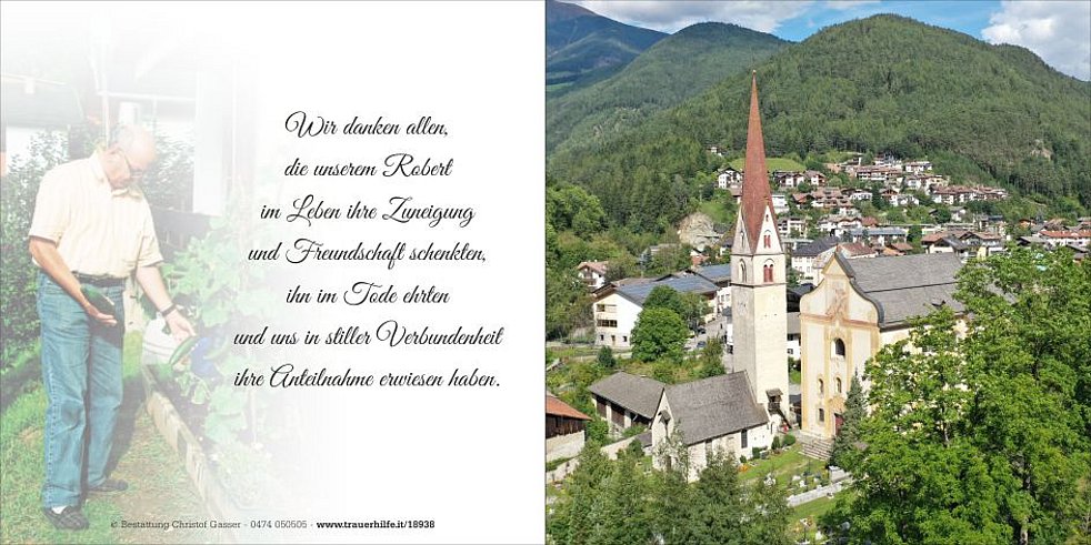 Ein herzlicher Dank gilt dem Hausarzt Herrn Dr. Andreas Reichegger, allen vom Hauspflegedienst sowie dem gesamten Pflegepersonal vom Altersheim Haus Eiseck in Klausen und der Privatklinik Bonvicini in Bozen für die liebevolle Betreuung und Begleitung.