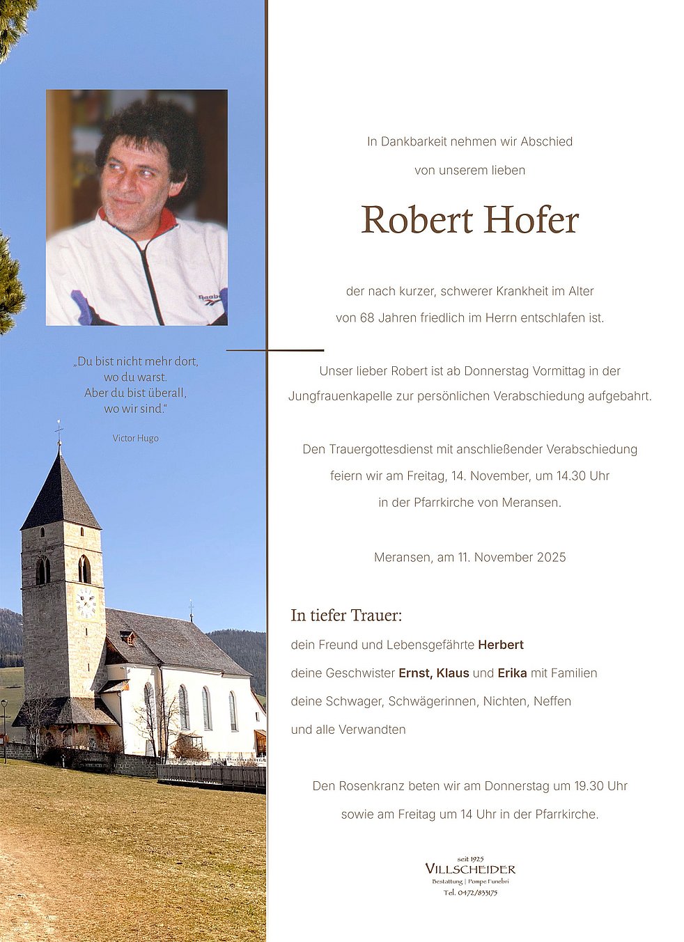 Trauerfeier: 14.11. - 14:30 Uhr Meransen