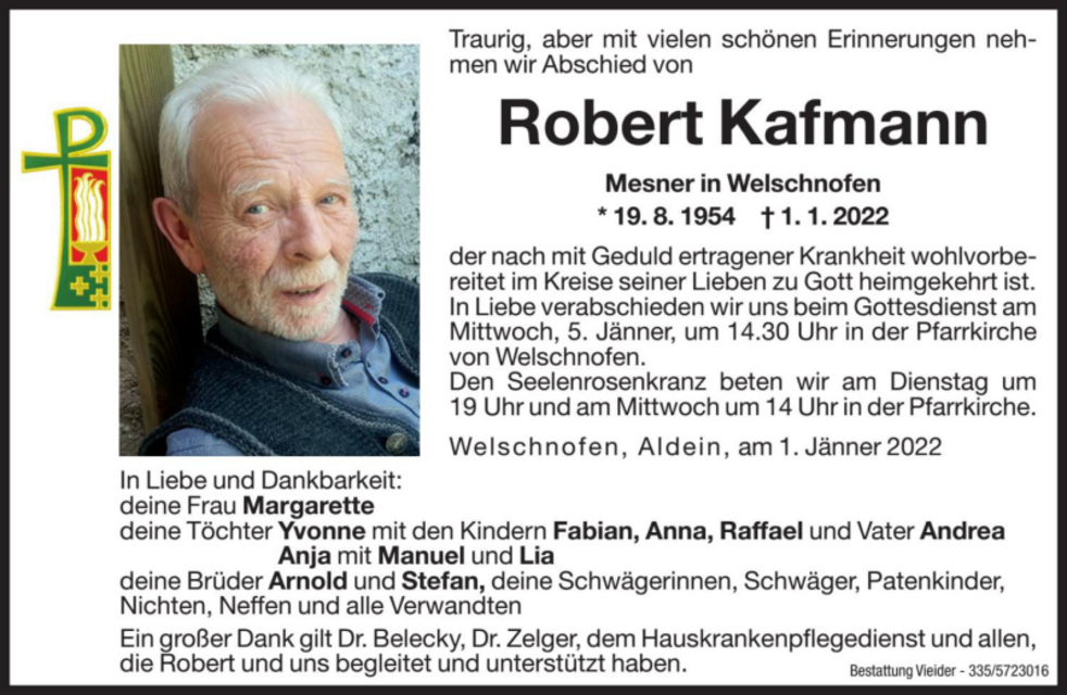 Die Mesner-Gemeinschaft der Diözese Bozen-Brixen nimmt aufrichtig Anteil am Heimgang unseres Mesnerkollegen Robert und spricht der Trauerfamilie Kafmann ein herzliches Beileid aus.