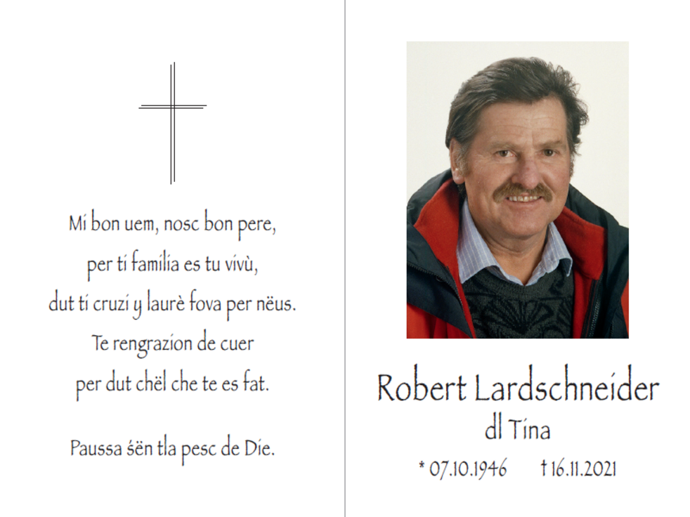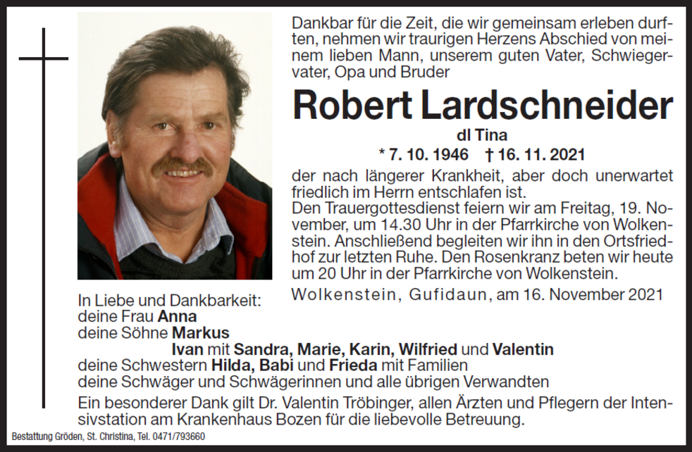 Den Trauergottesdienst feiern wir am Freitag, dem 19. November, um 14.30 Uhr in der Pfarrkirche von Wolkenstein. Anschließend begleiten wir ihn in den Ortsfriedhof zur letzten Ruhe.