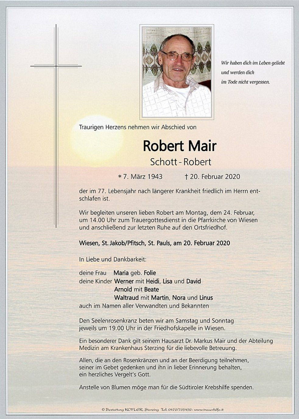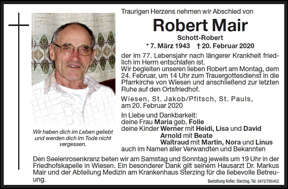 Wir begleiten unseren lieben Robert am Montag, dem 24. Februar, um 14.00 Uhr zum Trauergottesdienst in die Pfarrkirche von Wiesen und anschließend zur letzten Ruhe auf den Ortsfriedhof.