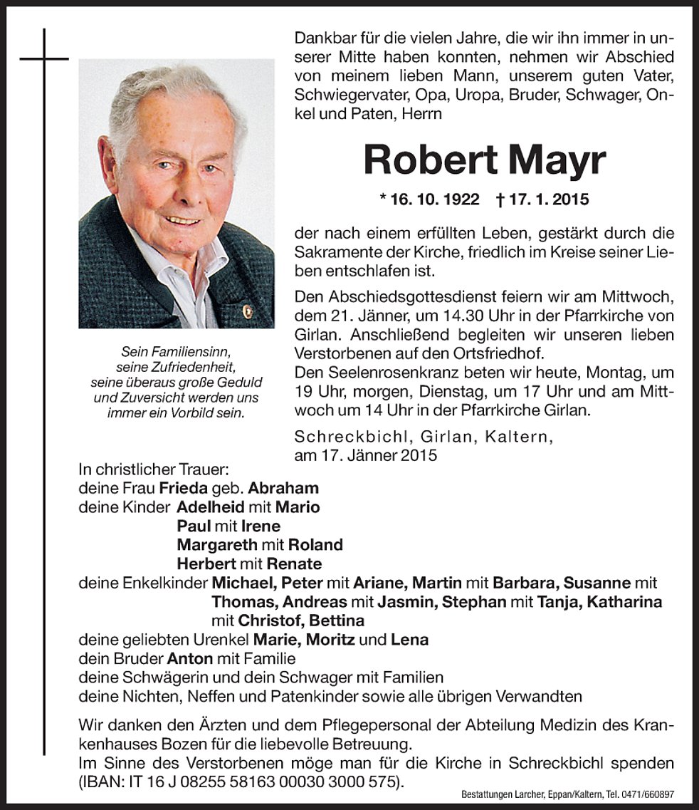 Wir danken den Ärzten und dem Pflegepersonal der Abteilung Medizin des Krankenhauses Bozen für die liebevolle Betreuung. Im Sinne des Verstorbenen möge man für die Kirche in Schreckbichl spenden (IBAN: IT 16 J 08255 58163 00030 3000 575).