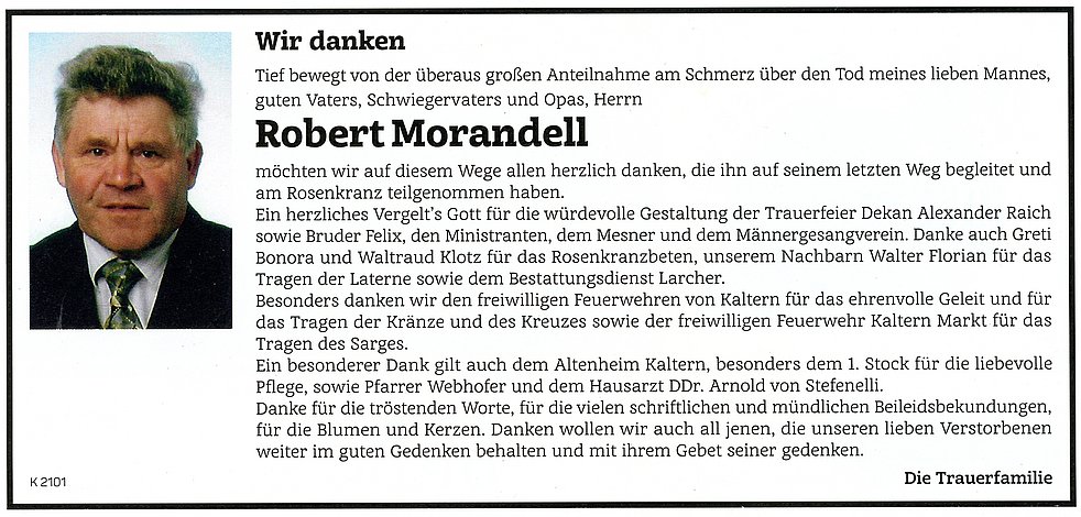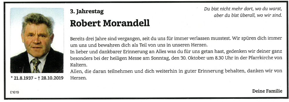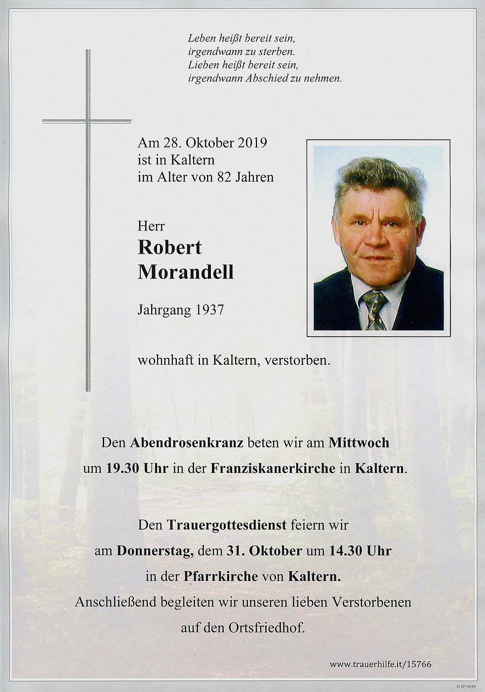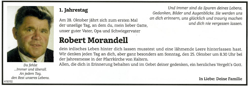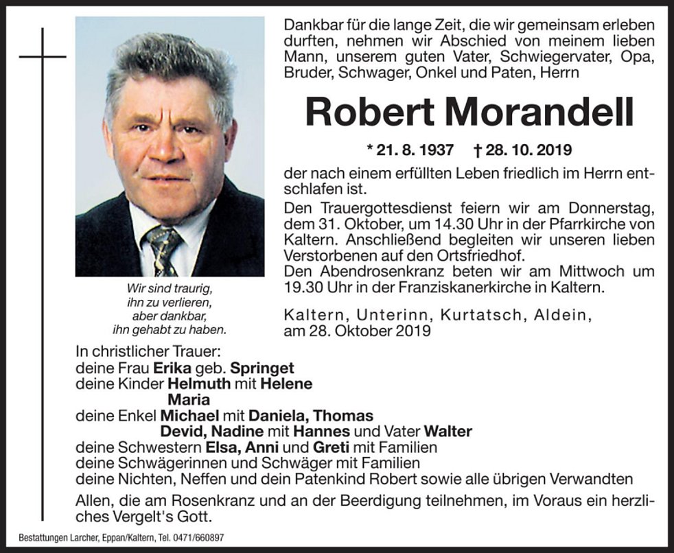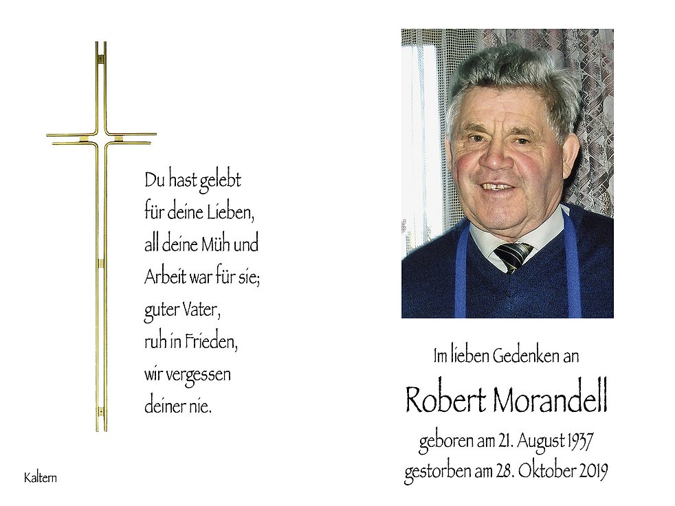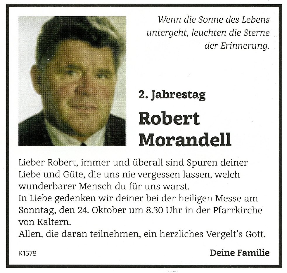 Den Trauergottesdienst feiern wir am Donnerstag, dem 31. Oktober, um 14.30 Uhr in der Pfarrkirche von Kaltern. Anschließend begleiten wir unseren lieben Verstorbenen auf den Ortsfriedhof.