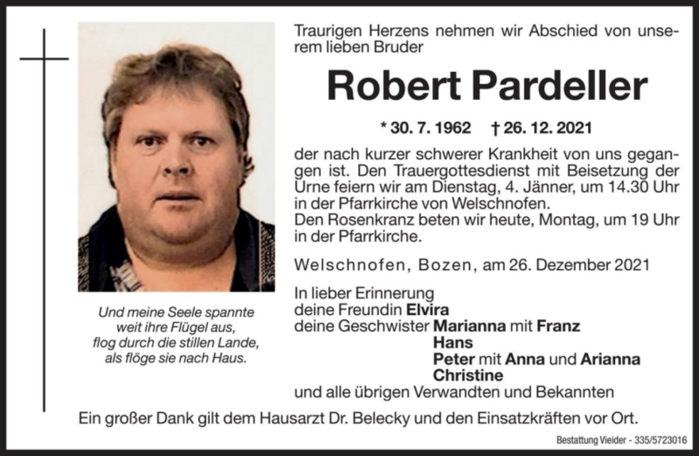 Den Trauergottesdienst mit Beisetzung der Urne feiern wir am Dienstag, 4. Jänner, um 14.30 Uhr in der Pfarrkirche von Welschnofen.