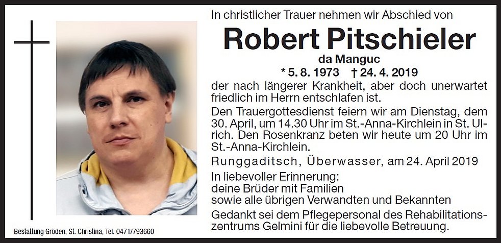 Den Trauergottesdienst feiern wir am Dienstag, dem 30. April, um 14.30 Uhr im St.-Anna-Kirchlein in St. Ulrich.