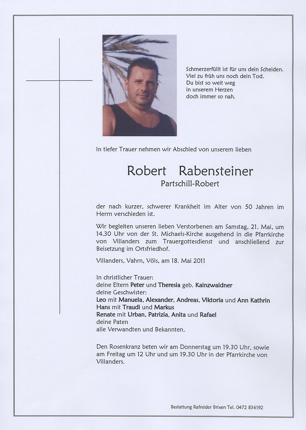 Wir begleiten unseren lieben Verstorbenen am Samstag, 21. Mai, um 14.30 Uhr von der St. Michaels-Kirche ausgehend in die Pfarrkirche von Villanders zum Trauergottesdienst und anschließend zur Beisetzung im Ortsfriedhof.