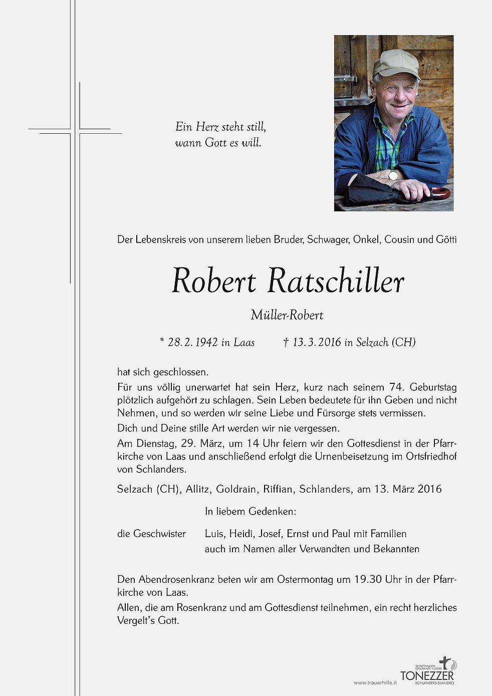 Am Dienstag, 29. März, um 14 Uhr feiern wir den Gottesdienst in der Pfarrkirche von Laas und anschließend erfolgt die Urnenbeisetzung im Ortsfriedhof von Schlanders.