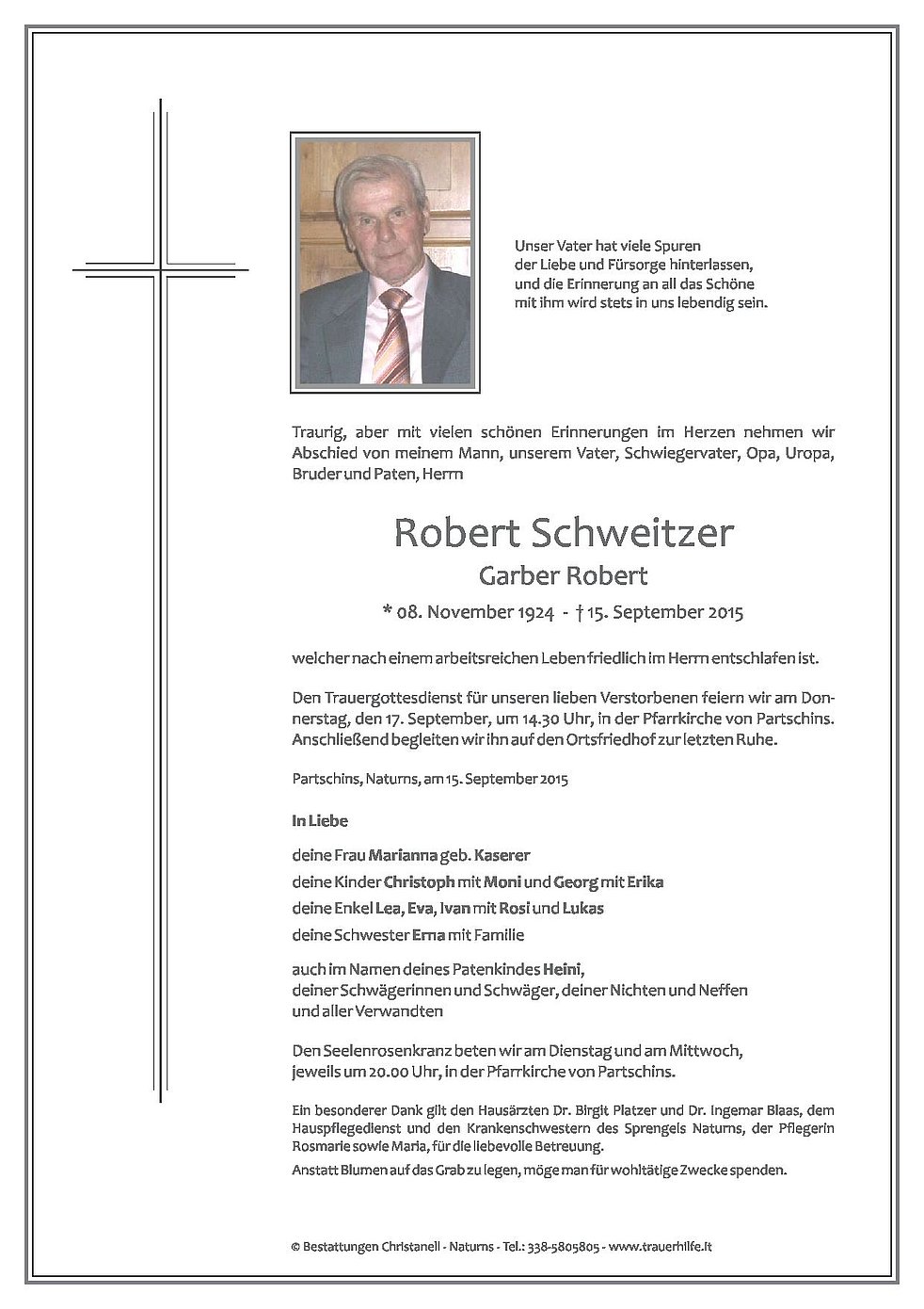 Den Trauergottesdienst für unseren lieben Verstorbenen feiern wir am Donnerstag, den 17. September, um 14.30 Uhr, in der Pfarrkirche von Partschins. Anschließend begleiten wir ihn auf den Ortsfriedhof zur letzten Ruhe.