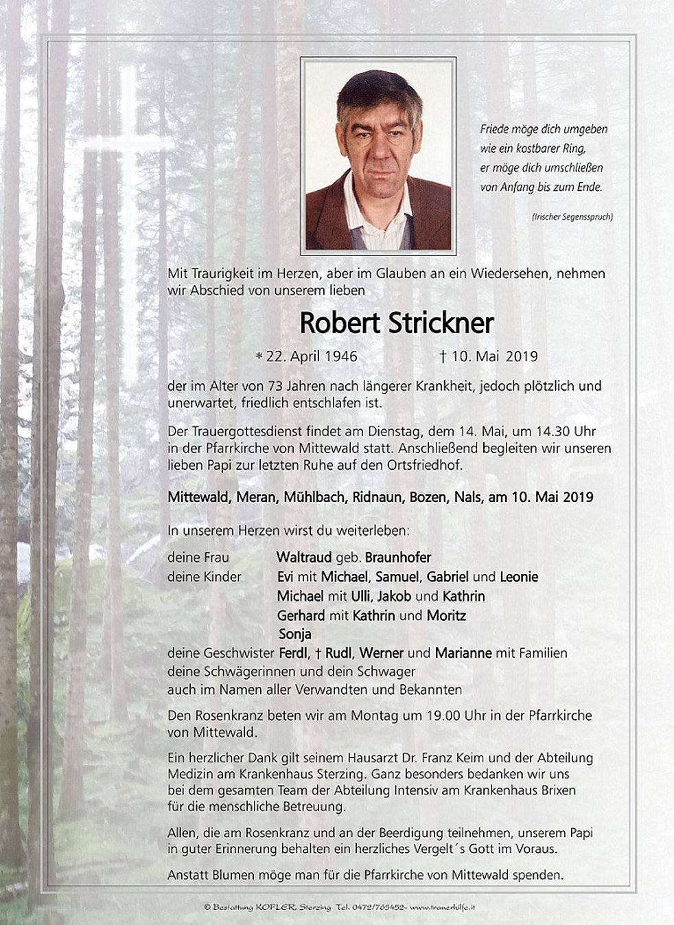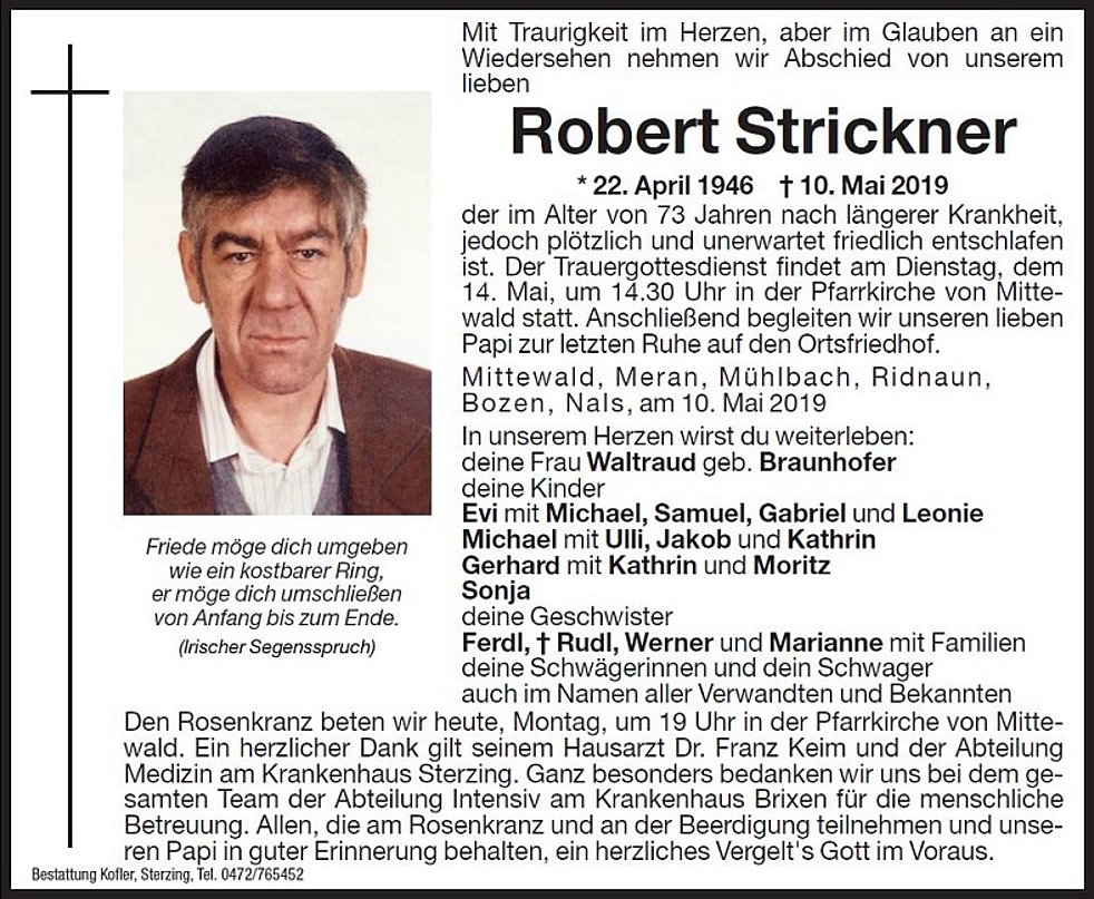 Der Trauergottesdienst findet am Dienstag, dem 14. Mai, um 14.30 Uhr in der Pfarrkirche von Mittewald statt. Anschließend begleiten wir unseren lieben Papi zur letzten Ruhe auf den Ortsfriedhof.