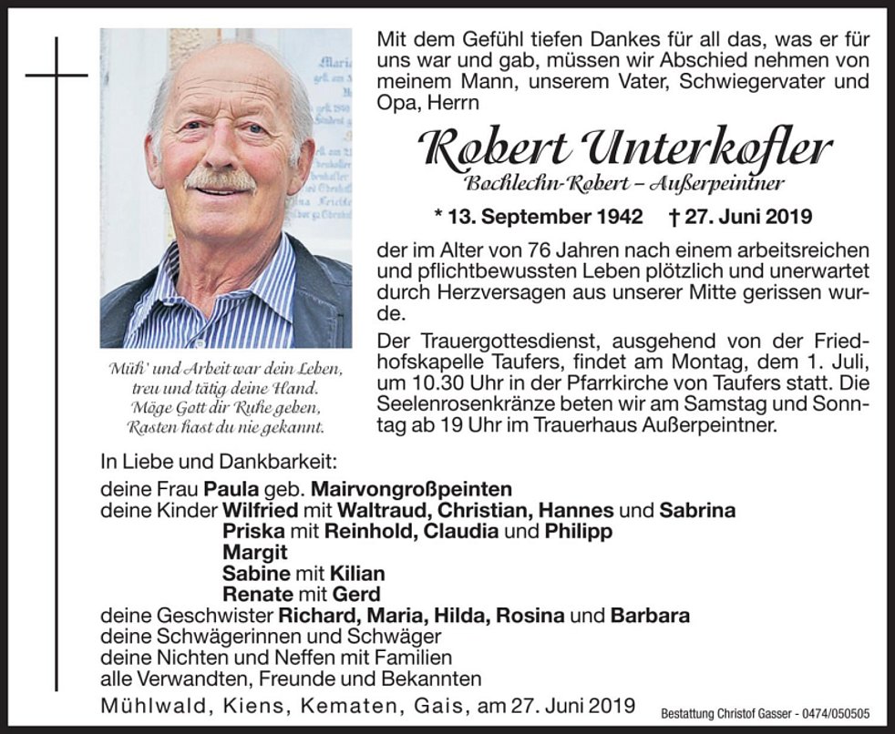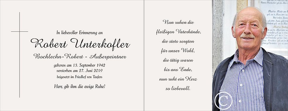 Der Trauergottesdienst, ausgehend von der Friedhofskapelle Taufers, findet am Montag, dem 1. Juli, um 10.30 Uhr in der Pfarrkirche von Taufers statt.