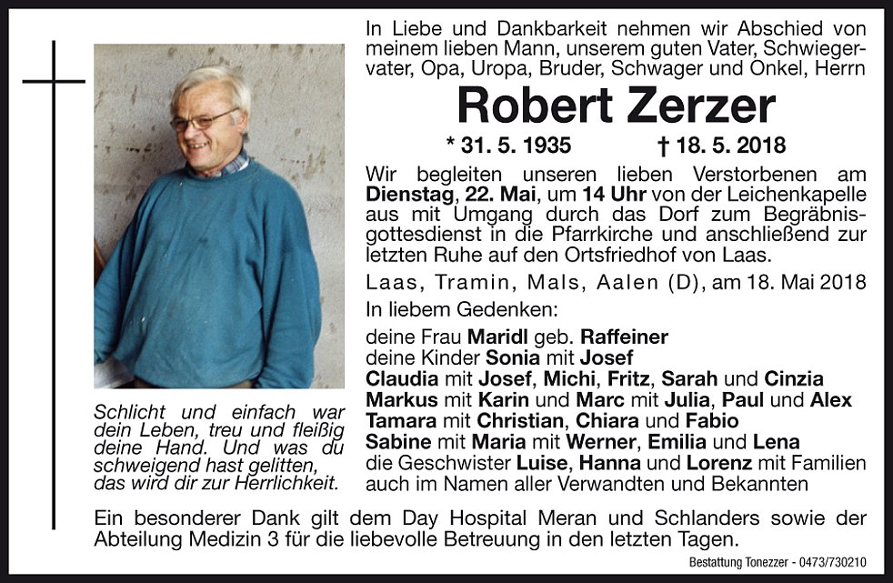 Wir begleiten unseren lieben Verstorbenen am Dienstag, 22. Mai, um 14 Uhr von der Leichenkapelle aus mit Umgang durch das Dorf zum Begräbnisgottesdienst in die Pfarrkirche und anschließend zur letzten Ruhe auf den Ortsfriedhof von Laas.