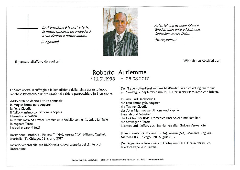 Den Trauergottesdienst mit anschließender Verabschiedung feiern wir am Samstag, 2. September, um 15.00 Uhr in der Pfarrkirche von Brixen.