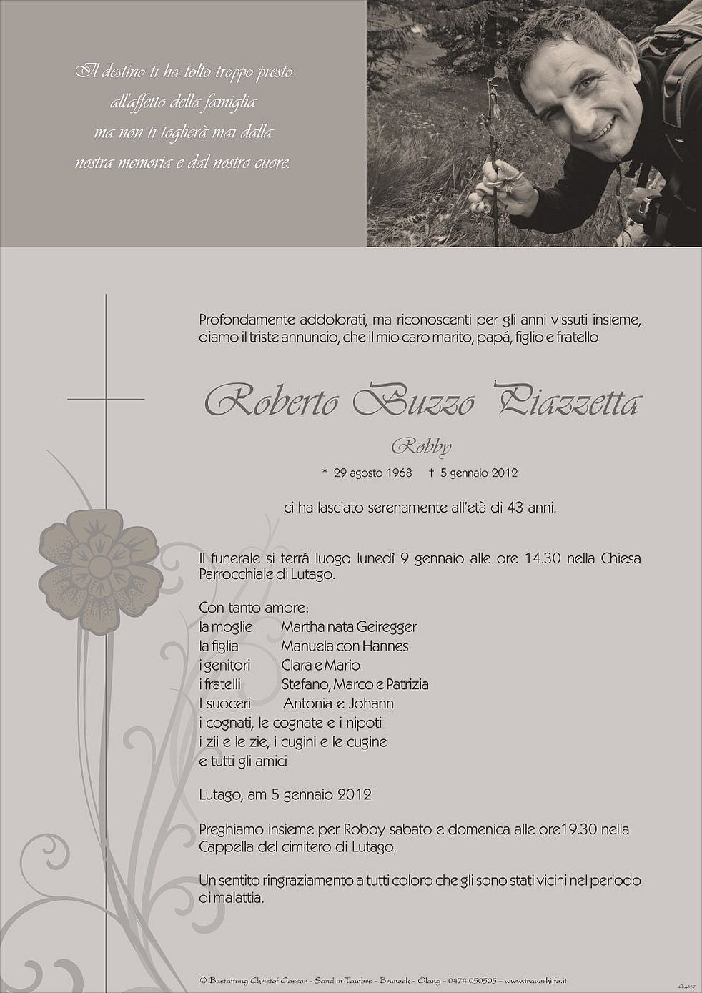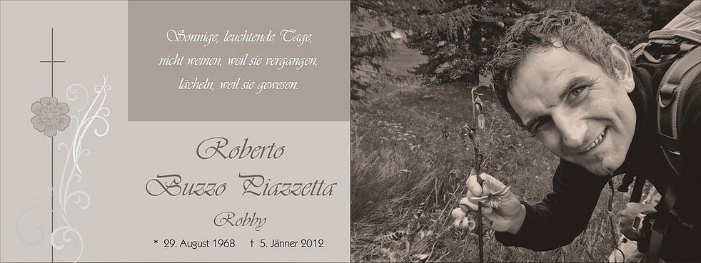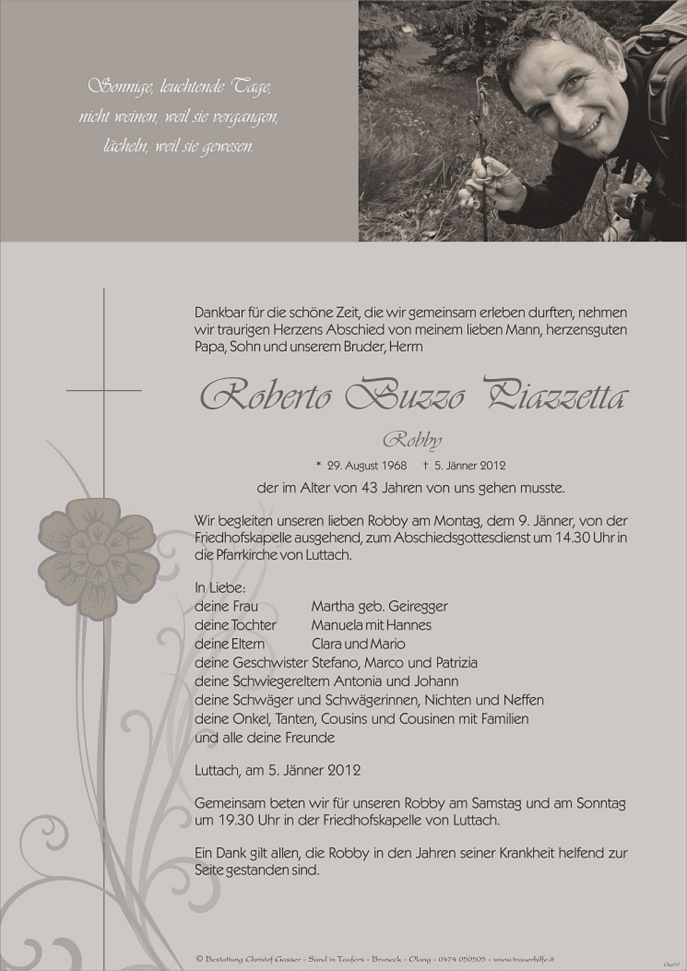 Gemeinsam beten wir für unseren Robby am Samstag und am Sonntag um 19.30 Uhr in der Friedhofskapelle von Luttach. Ein Dank gilt allen, die Robby in den Jahren seiner Krankheit helfend zur Seite gestanden sind.
