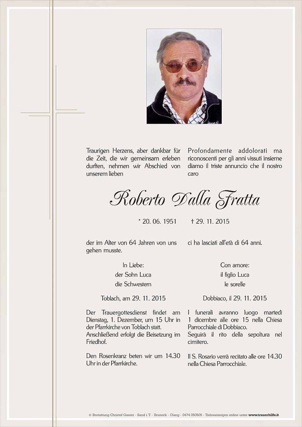 Der Trauergottesdienst findet am Dienstag, 1. Dezember, um 15 Uhr in der Pfarrkirche von Toblach statt.