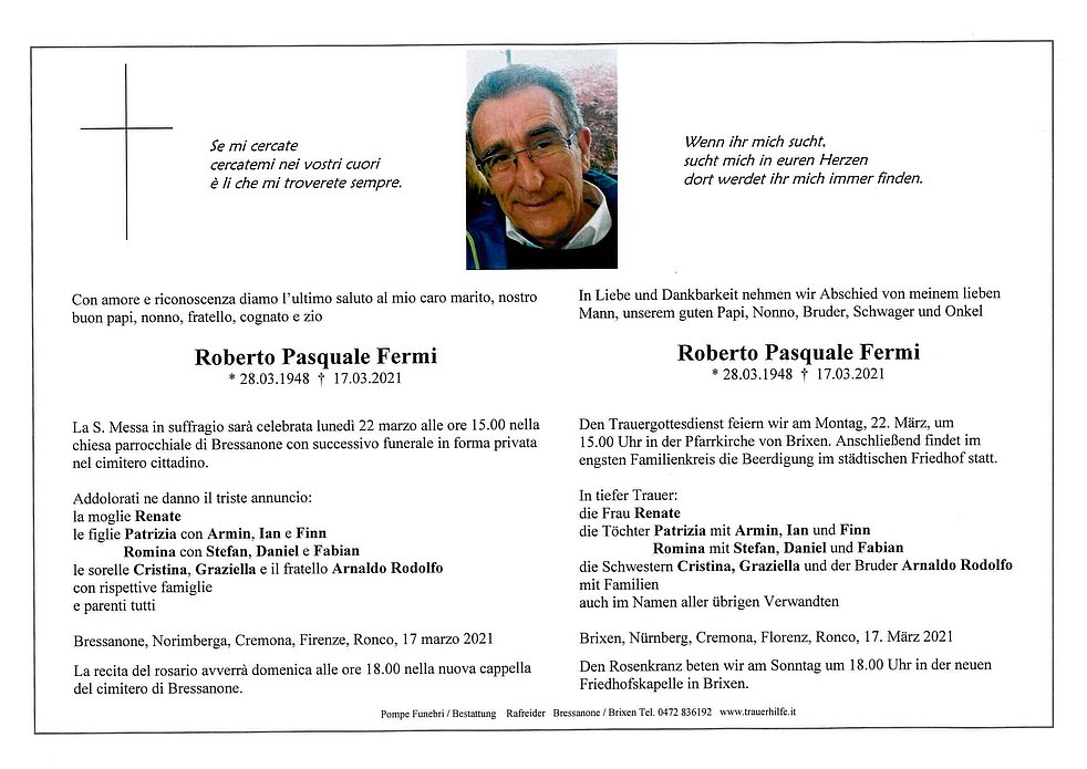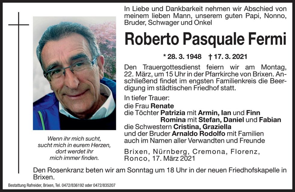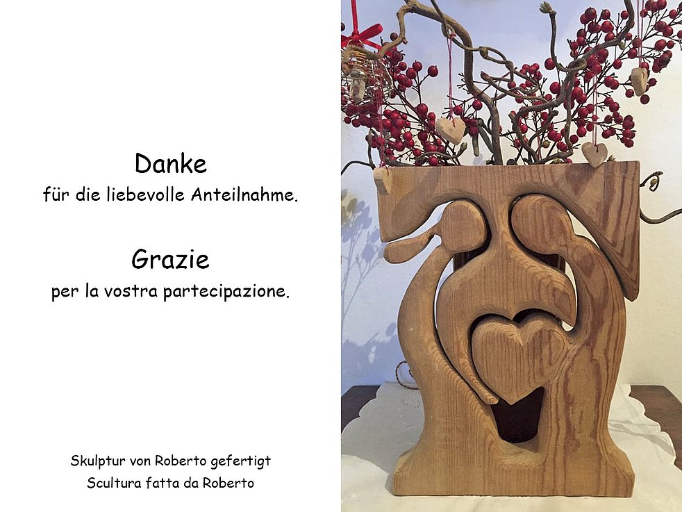 Den Trauergottesdienst feiern wir am Montag, 22. März, um 15 Uhr in der Pfarrkirche von Brixen. Anschließend findet im engsten Familienkreis die Beerdigung im städtischen Friedhof statt.