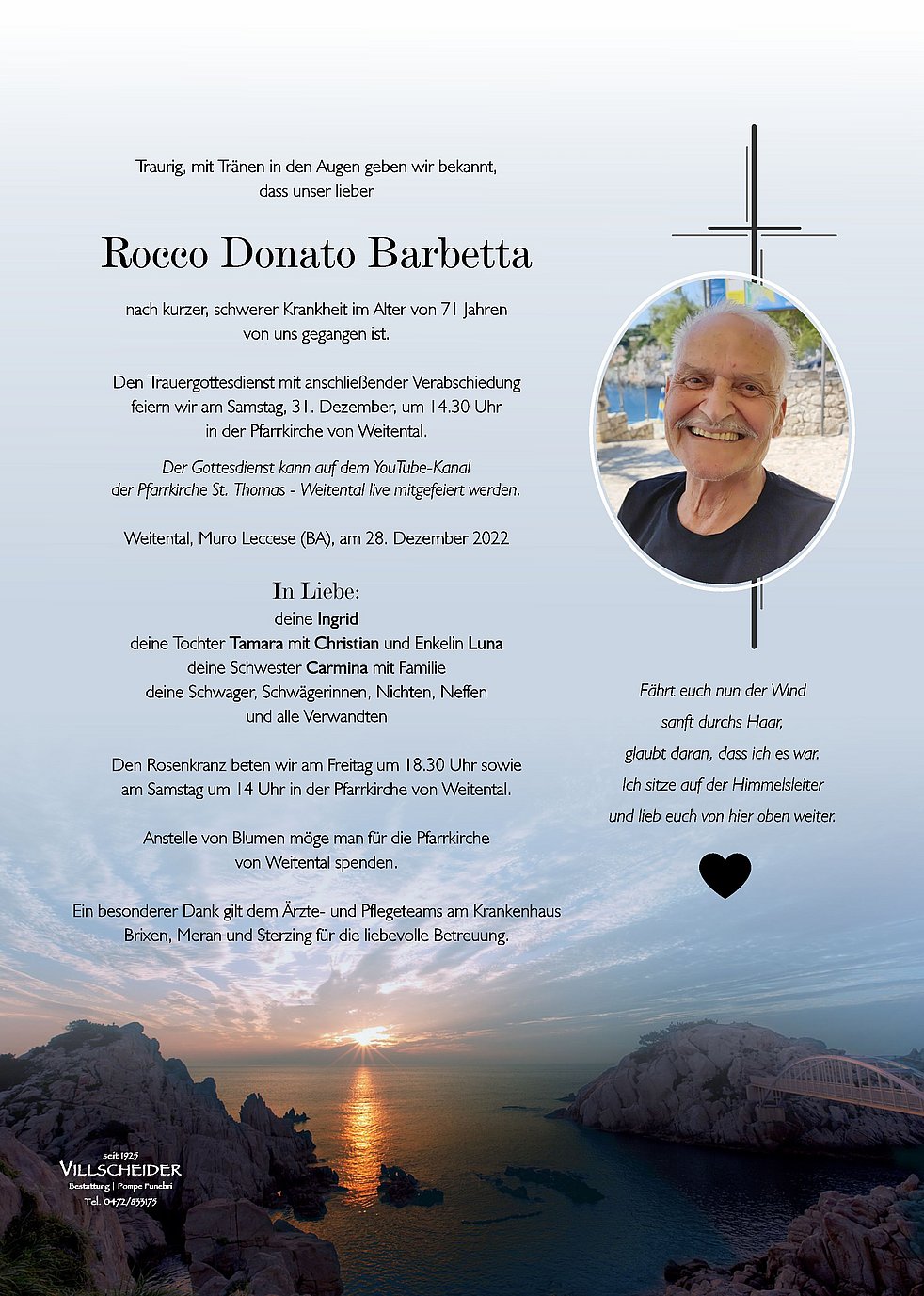 Es heißt Abschied nehmen von einem lieben Menschen der euch so viel bedeutet hat. Und ihr bleibt mit Tränen in den Augen und im Herzen voller Dankbarkeit zurück. Auch wenn ihr gesehen habt, dass die Sonne langsam untergeht, so ist euer Schmerz trotzdem unermesslich. Fragt nicht "Wozu", fragt nicht "Warum", denn der Schicksalsmund bleibt doch nur stumm.